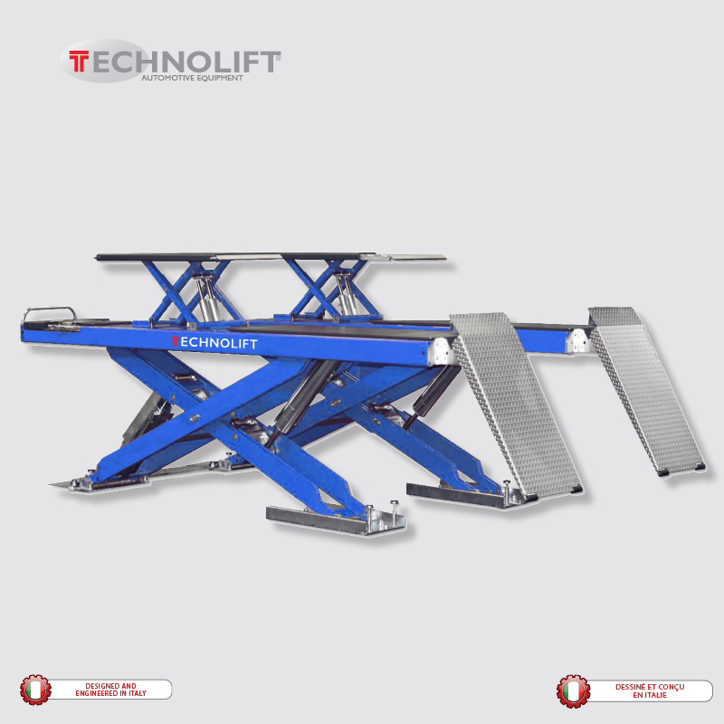 Élévateur à ciseaux de construction robuste de 12000 lbs de capacité pour alignement avec élévateur auxiliaire. L'élévateur principal et l'élévateur auxiliaire sont activés par 2 cylindres hydrauliques sur chaque ciseau des élévateurs et les barrures sont pneumatiques. Peut être installé en surface ou encastré.